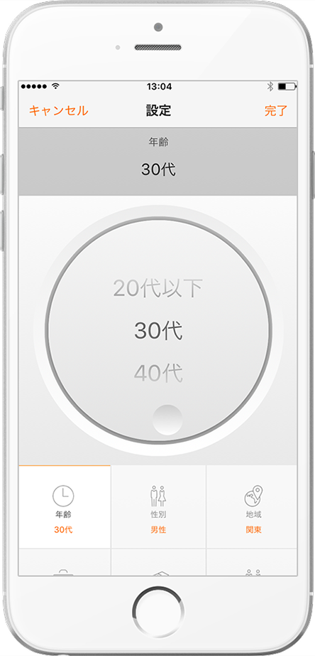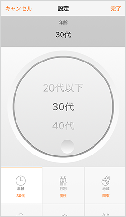 使い勝手のよいインターフェースにより、当行スマホアプリで気軽に探索いただけます。9つのプロファイル項目をダイアルで選んでいくだけの直感的な操作で、平均金融資産データを簡単に絞り込みできます。