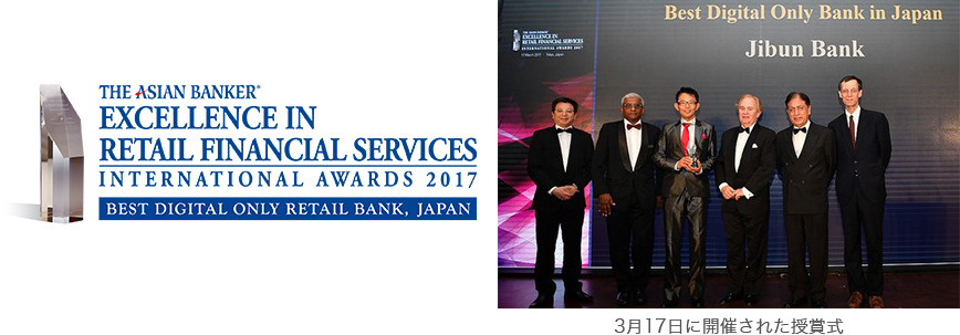株式会社じぶん銀行(本社:東京都中央区、代表取締役社長:鶴我 明憲、以下「じぶん銀行」)は、2017年3月17日(金)、アジア地域の銀行専門誌「The Asian Banker」が主催する「The International Excellence in Retail Financial Services Awards 2017」において、「Best Digital Only Retail Bank in Japan(最優秀ネット銀行賞)」を受賞しました。