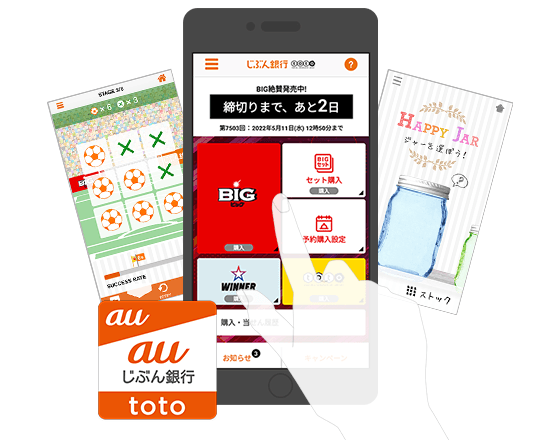 スマートフォンアプリ「じぶん銀行totoアプリ」を使えば、専用の購入画面から「WINNER」「BIG」「toto」を簡単に購入いただけます。当せん結果もアプリでスムーズに確認!