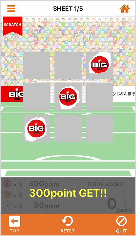 SCRATCH MODEは、9つのパネルの中から3つのパネルを削り、絵柄をそろえてポイントを獲得していくスクラッチタイプのゲームです。