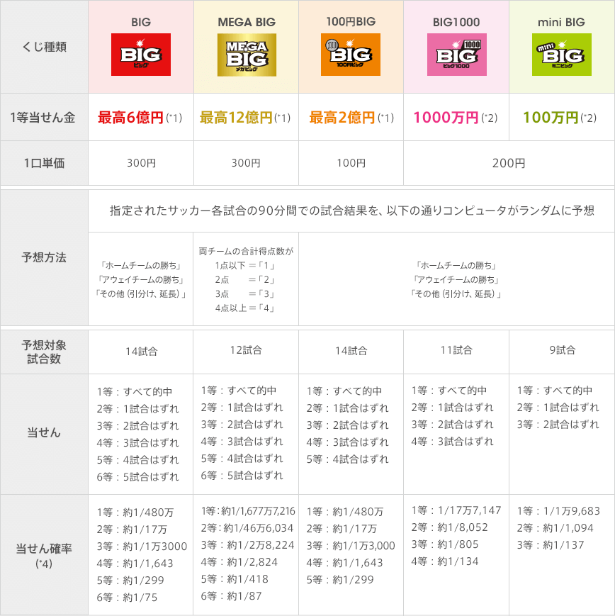 指定されたサッカー9試合の90分間での試合結果を予想する1口200円のくじです。予想は、コンピュータがランダムに行います。