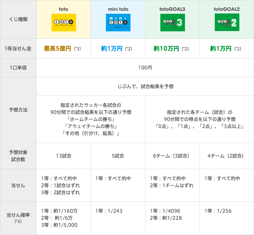 指定された4チーム(2試合)の90分間での各チームの得点をお客さま自身で予想する1口100円のくじです。