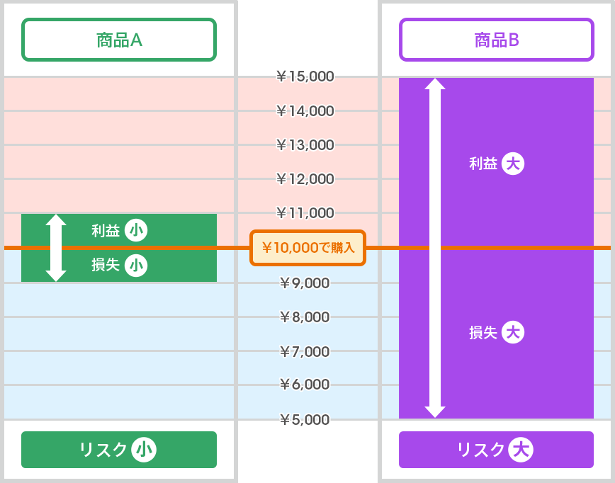 投資の世界で使われる「リスク」という言葉は「不確実なこと、ブレること」をいい、必ずしも損失を意味するわけではありません。たとえば、価格が変動する2種類の金融商品をそれぞれ10,000円で買ったとします。商品Aは11,000円と9,000円の間で価格が変動することが多く、商品Bは15,000円と5,000円の間で変動することが多いとした場合、商品Bの方が価格のブレ幅が大きいことになります。このブレ幅を「リスク(価格変動リスク)」といいます。ブレ幅が小さい商品Aは、損失が出るとしても少額でしょうが、利益(リターン)も小さくなります。一方商品Bは、大きく値下がりする可能性はありますが、大きな値上がりも期待できます。自分がどの程度のブレ幅(リスク)なら許容できるかを考えて商品を選ぶといいでしょう。