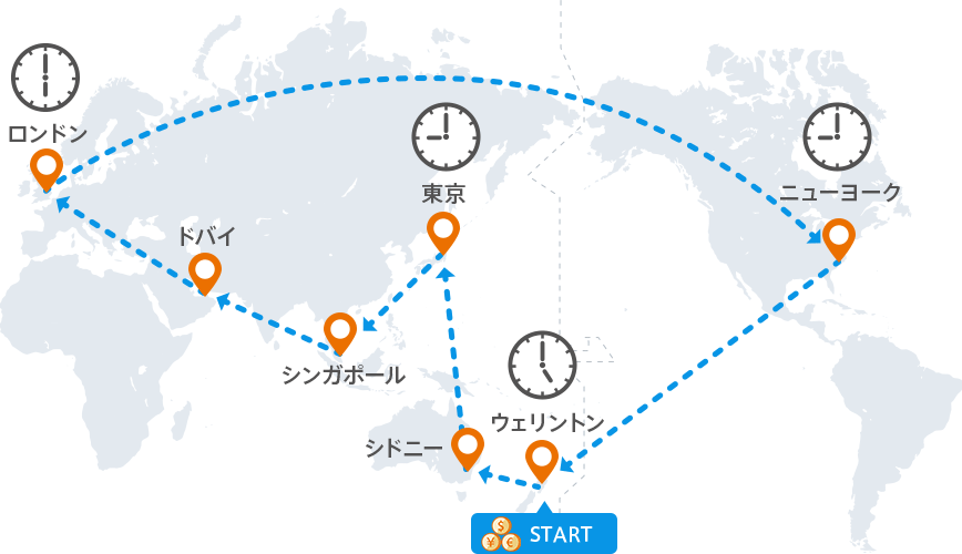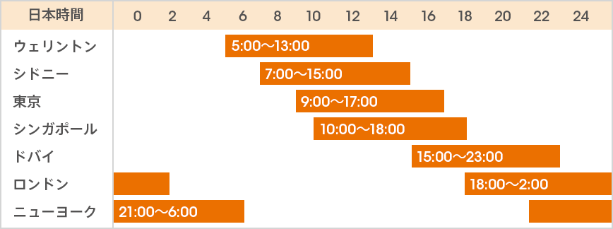 1日で最も早く動き出すのは、ニュージーランドのウェリントン市場で、日本時間の朝5:00頃から取引が始まります。次いで、シドニー、東京、シンガポール、ドバイ、フランクフルト、ロンドンの順に取引の中心が移っていきます。最後が日本時間の21:00頃から動き出すニューヨーク市場で、翌朝6:00頃まで取引が続きます。