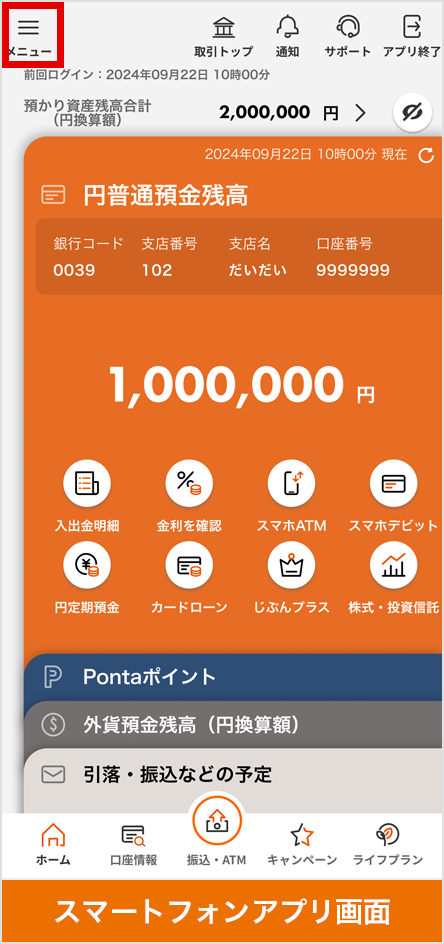 じぶん銀行アプリにログインし、画面左上の「メニュー」を選択