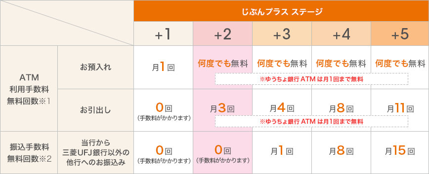 じぶんプラスは、お預入れ残高や商品・サービスのご利用状況に応じてステージをアップすることが可能です。ステージアップすれば、無料回数がさらに増えます。