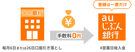 毎月一定額をauじぶん銀行口座に取寄せできるため、給与振込口座からの振込みや、ATMで入金する手間が省けます。 auじぶん銀行口座に取寄せした資金は、ローンやクレジットカード、家賃の口座振替や外貨積立などの定期的なお取引にご活用いただけます。