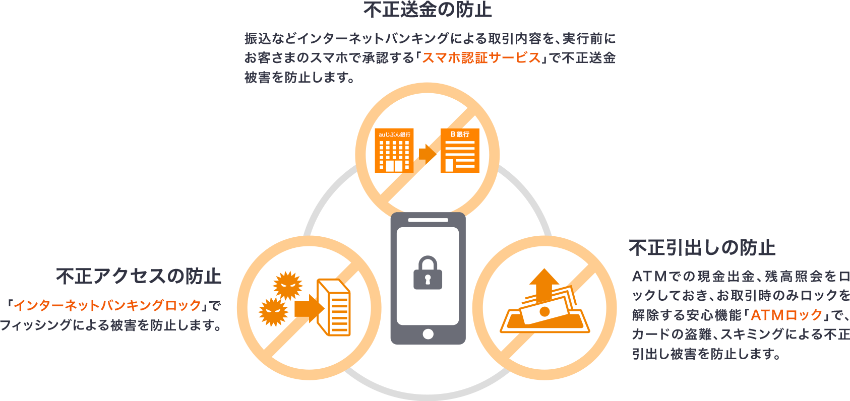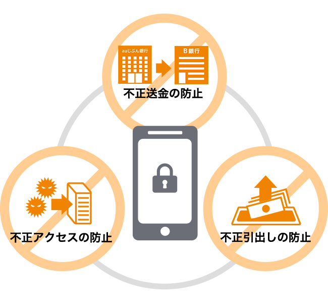 不正送金・不正引出し・不正アクセスなどのさまざまなセキュリティを備えています。