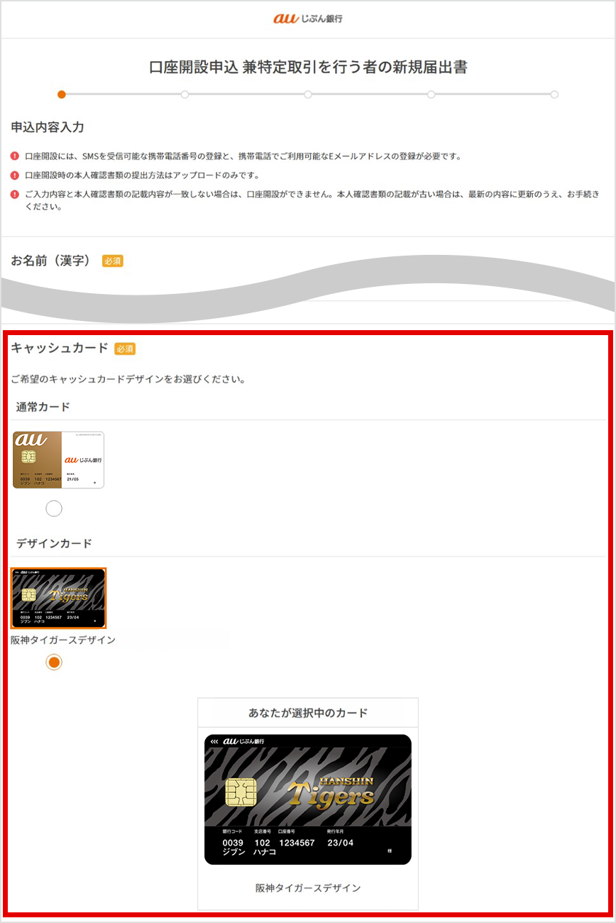 auじぶん銀行の口座を新規でお申込みの際、通常デザインか阪神タイガースデザインを選ぶことができます。すでに口座をお持ちのお客さまもデザインを変更することができます。