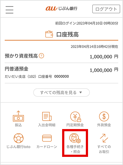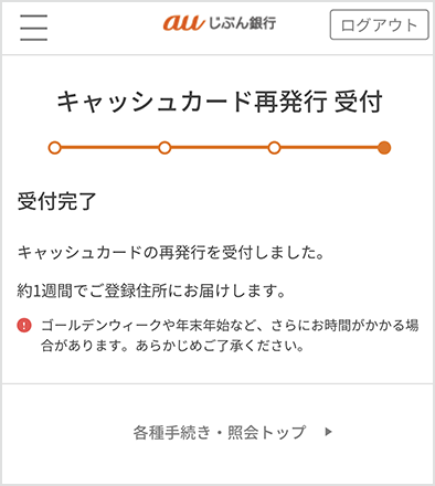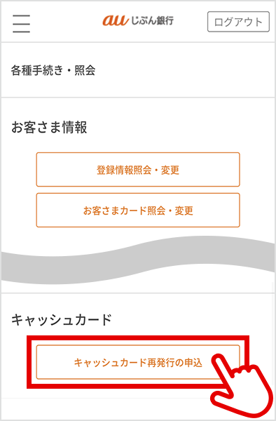 キャッシュカードの「キャッシュカード再発行の申込」を選択