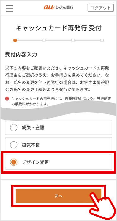 カード再発行理由より「デザイン変更」を選択し、「次へ」をタップ