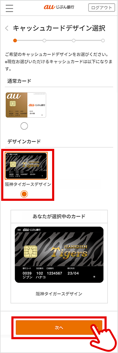 ご希望のデザインのキャッシュカードを選択し、「次へ」をタップ