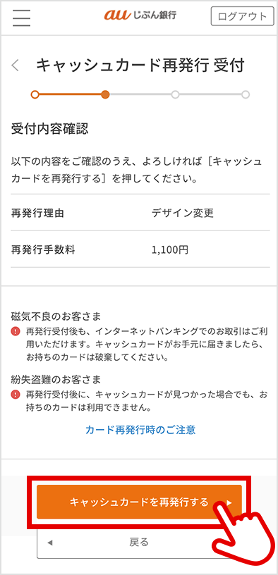 内容を確認し、「キャッシュカードを再発行する」を選択