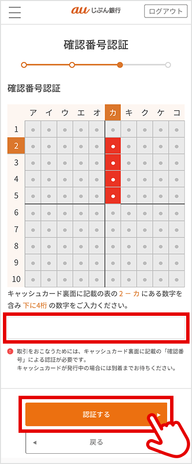 キャッシュカード裏面の表と画面の表を照らし合わせて確認番号を入力し、「認証する」を選択