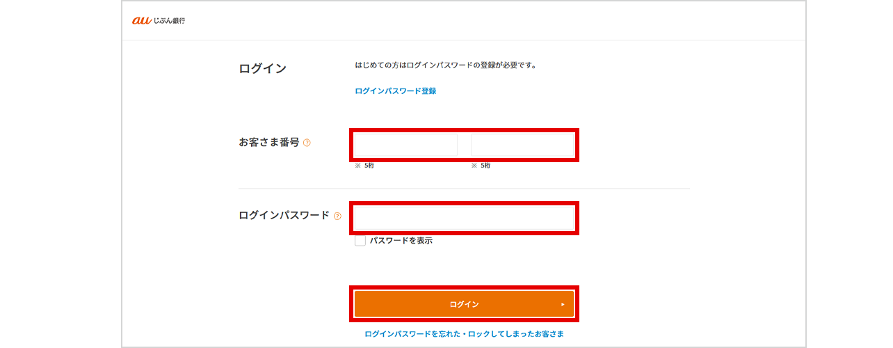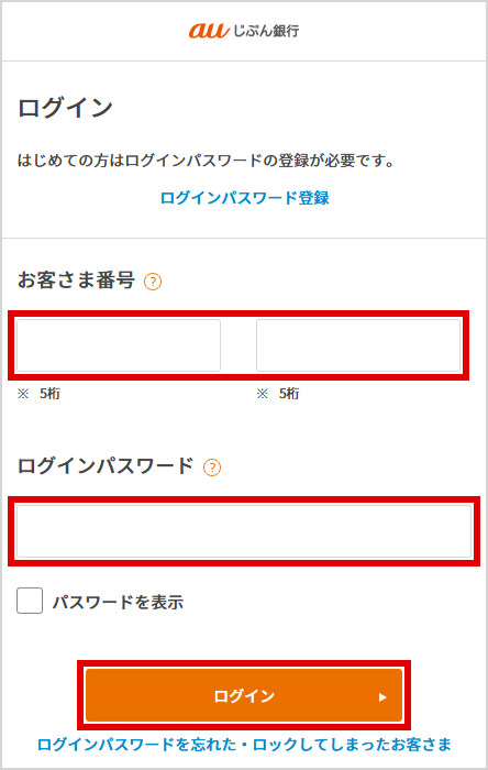 お客さま番号と、ログインパスワードを入力し、ログインを選択