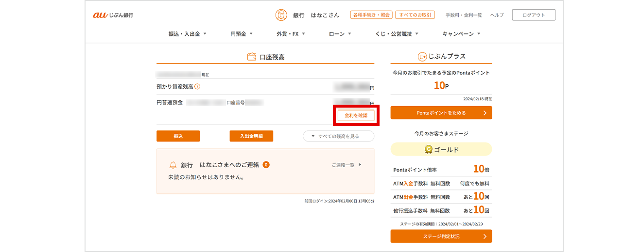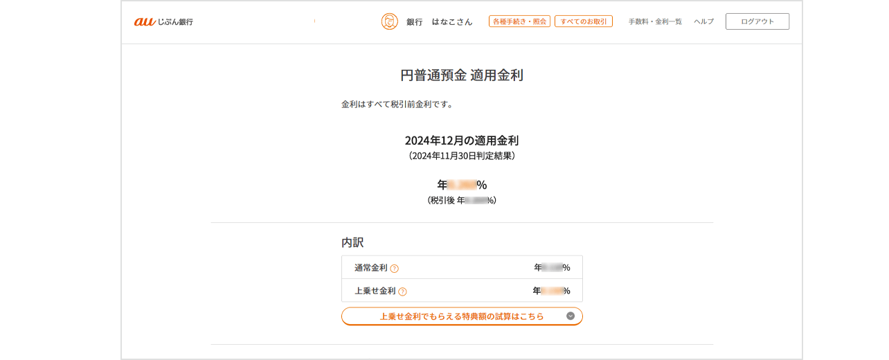 「円普通預金 適用金利」画面上部中央より確認できます。