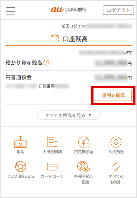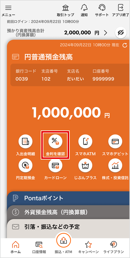 アプリログイン後、トップ画面にある[金利を確認]を選択