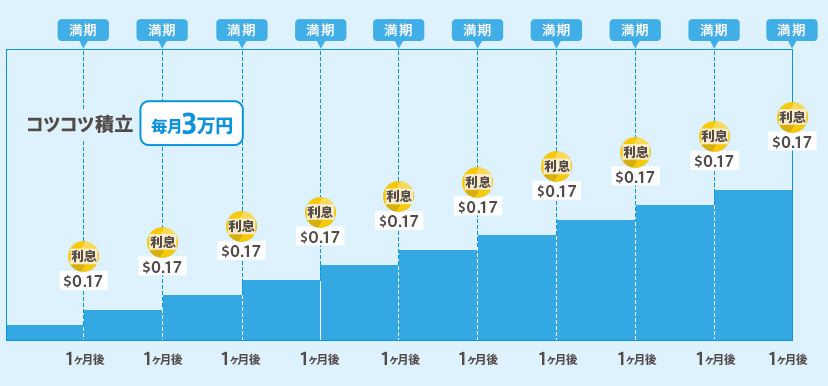 ■1ヶ月もの米ドル定期預金 年1%(税引後 年0.79%)に月3万円を10ヶ月間お預入れいただいた場合の受取利息
