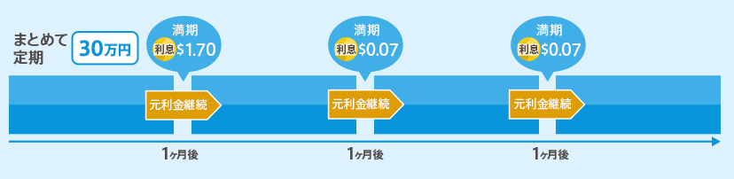 - ※30万円お預入れいただき、満期後、自動継続した場合の1ヶ月後にお受取りいただける利息計算式[2,500米ドル×0.04%×31日÷365日=0.08米ドル(税引前)、0.08米ドル−0.01米ドル=0.07米ドル(税引後)]
