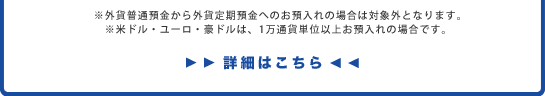 ※外貨預金には為替変動リスクがあります。外貨預金の預入時(円→外貨)より払戻時(外貨→円)の為替相場が円高になる場合、または為替相場にまったく変動がない場合でも、往復の為替手数料(1米ドル/1ユーロあたり50銭、1豪ドルあたり1円、1中国元あたり80銭)がかかるため、払戻時の円換算額が、預入時の円貨額を下回る(円貨ベースで元本割れとなる)可能性があります。また、中国元は、中国政府の通貨政策の変更などによる流動性の低下などにより、お取引を停止することがあります。お申込前に必ず重要事項説明をご覧ください。