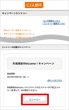 外貨預金Welcome!キャンペーンを選んで、エントリーボタンを押す