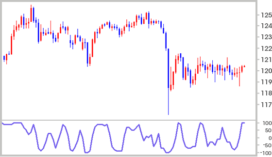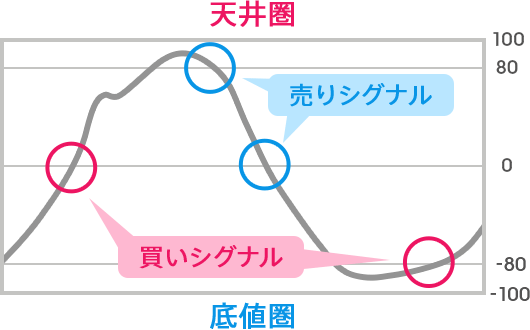 - 買われ過ぎの+100に接近した後、反転下落し始めたとき