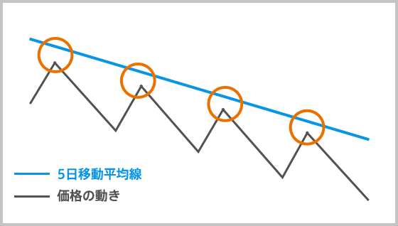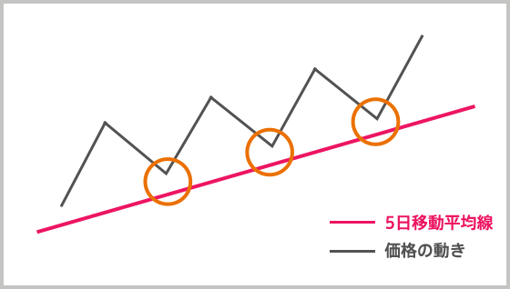 例えば、強い上昇が続いている場合、投資家の心理状態としては「できれば安いところで買いたい」と考えている人がほとんどでしょう。そのような心理状態のなか、過去に5日移動平均線まで下げると、決まって上昇する動きが頻繁に見られていたとすると、5日移動平均線まで我慢し、この水準で買いに動く人が多くなる傾向があります。