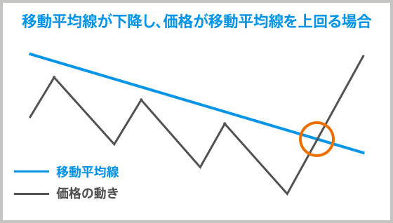 期間の長い移動平均線は、下落する以前から買っていた人が多いため、売りたいという重りがあるといえ、期間の短い移動平均線が越えてくるということは、この重りが除かれたということで、上がりやすくなります。