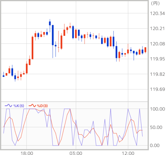 2本の線をそれぞれ「%K(パーセントK)」、「%D(パーセントD)」と呼びます。