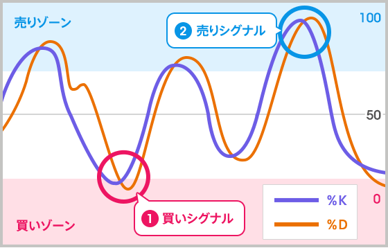 基本となる「%K」と、%Kを平均した「%D」という動きの異なる2本の線を表示し、その位置や2本線の交わり方から売買タイミングを判断することになります。