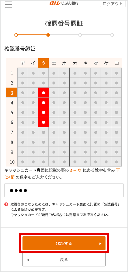 キャッシュカード裏面の表と画面の表を照らし合わせて確認番号を入力し、[認証する]を選択