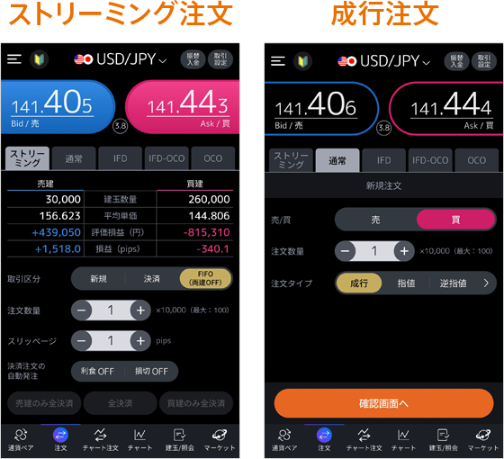 - ストリーミング注文は注文数量・スリッページを指定し、為替レートの動きを見ながらリアルタイムに注文します。