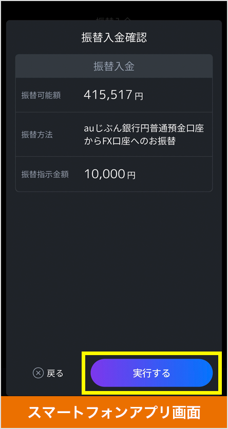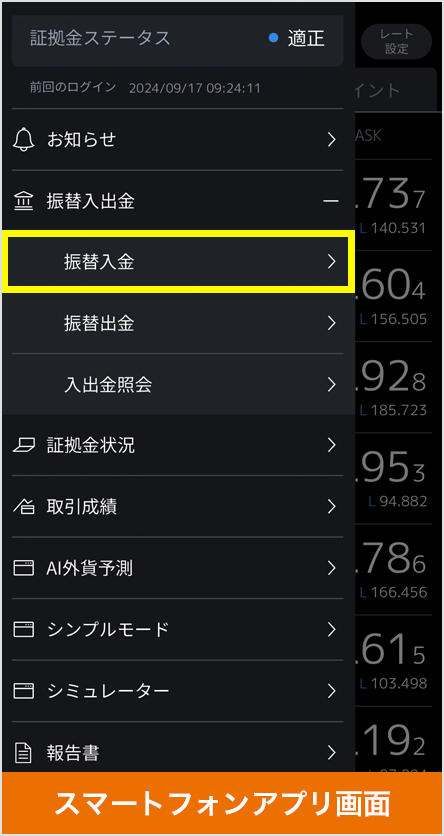 FXアプリを起動後、左上のメニューから「振替入金」を選択