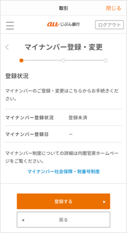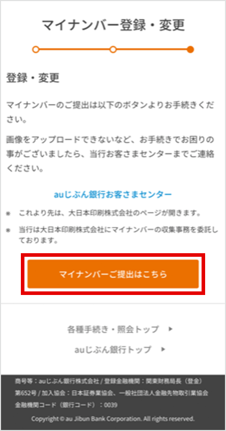 - ※個人番号(マイナンバー)のご準備ができていないお客さま、または郵送での提出をご希望のお客さまは「②個人番号(マイナンバー)を提出」からご対応いただけます。