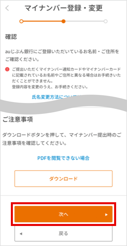 [ダウンロードボタン]より、マイナンバー提出時の注意事項を確認のうえ、[次へ]を選択