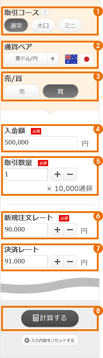 ご入力いただいた「入金額」および「新規注文レート」で保有可能な最大の通貨数量を表示しています。