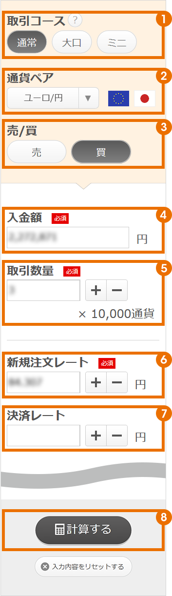 - 両建ておよび複数通貨ペアをお取引されている場合のシミュレーションは行えません。