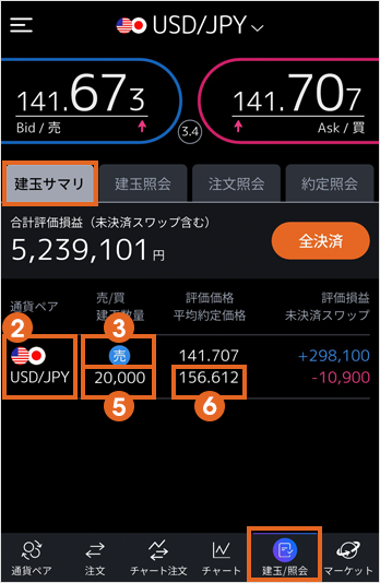 じぶん銀行FXアプリの【建玉/照会】から[建玉サマリー]を選択。以下の通りご入力ください。