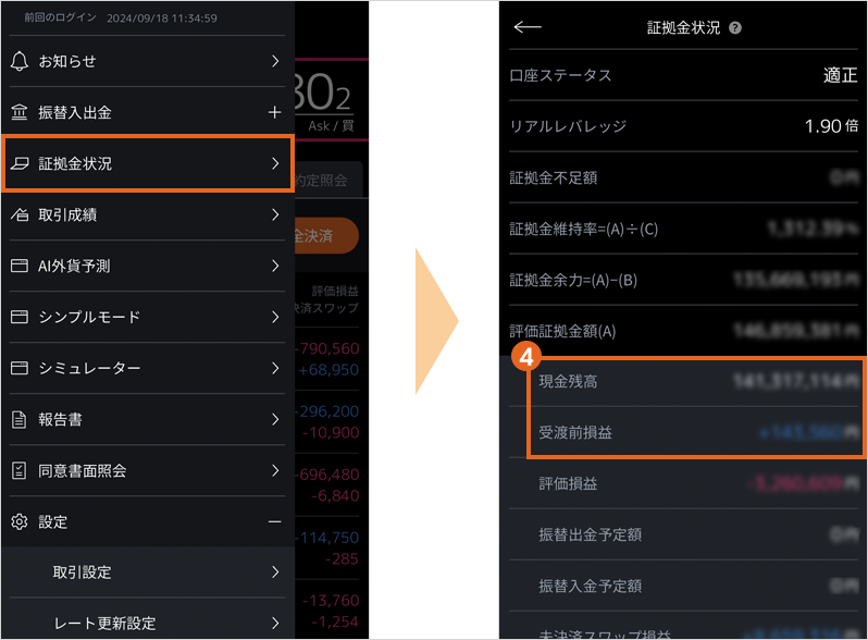 左上のメニューから[証拠金状況]を選択。[現金残高]と[受渡前損益]を合算した金額を「入金額」にご入力ください。