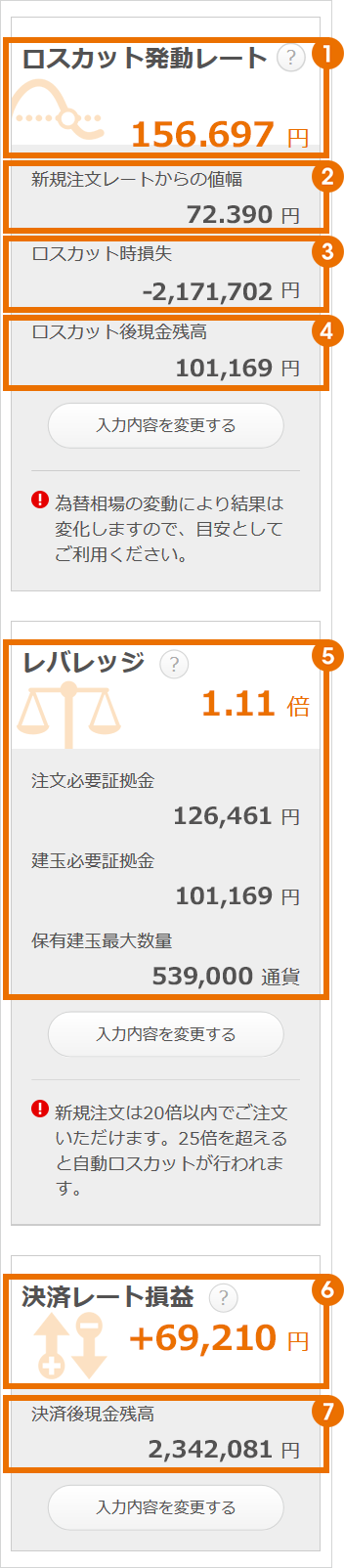 現在お持ちの建玉のロスカット発動レートをシミュレーションできます。