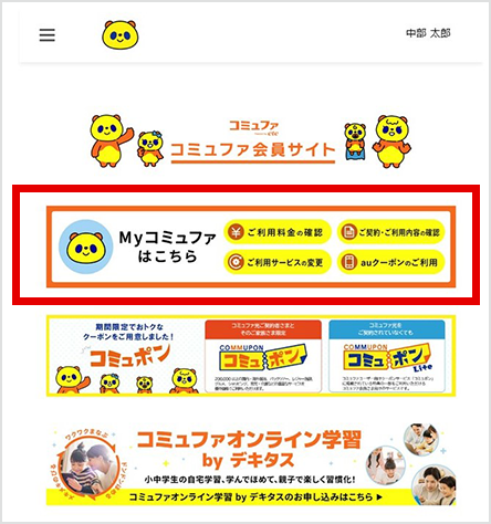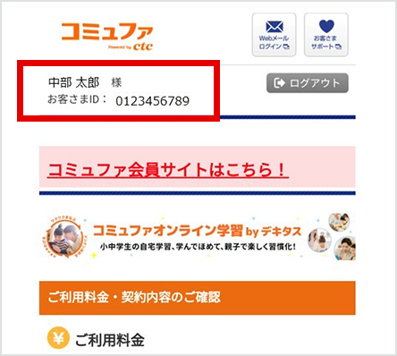 Myコミュファ画面上部にて契約者氏名、お客さまIDをご確認いただけます。