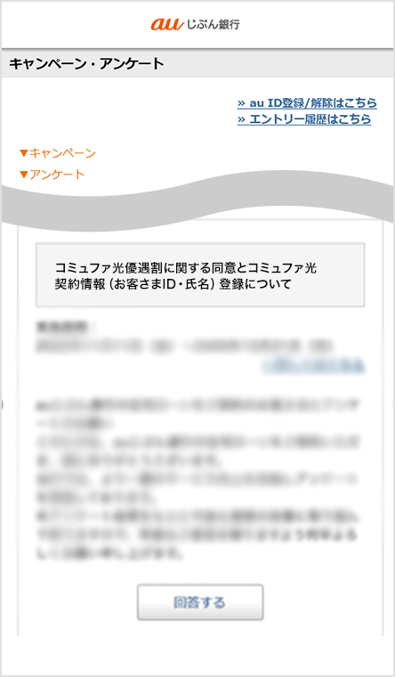 「アンケート」一覧から「コミュファ光優遇割に関する同意とコミュファ光契約情報(お客さまID・氏名)登録について」から「回答する」を選択