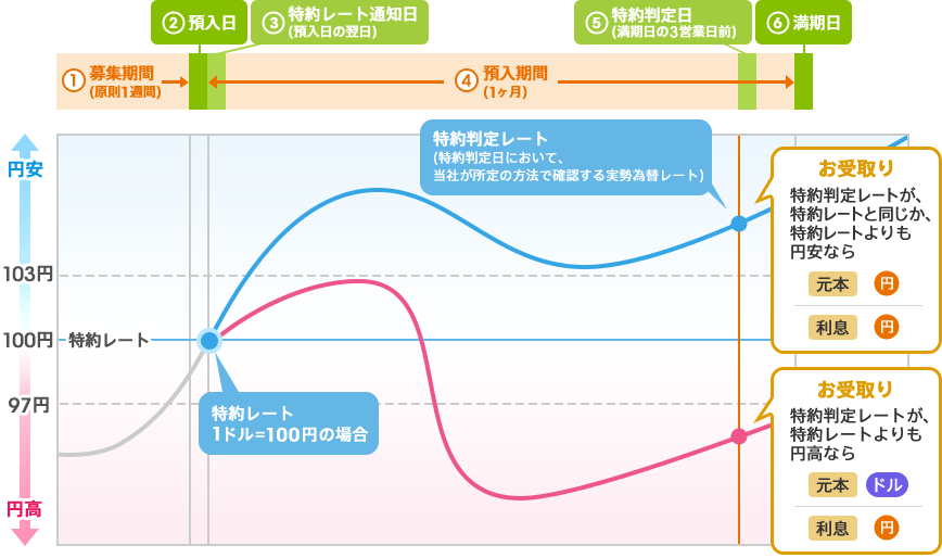 特約レートより円安もしくは同値となった場合は元本を「円」で、円高となった場合は「外貨」で払戻します。特約の実行に関わらず、利息は円でお支払いたします。