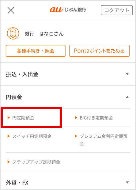 ログイン後、画面左上のメニューより、円預金の「円定期預金」を選択