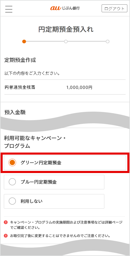 お取引時に表示される[利用可能なキャンペーン・プログラム]にて【ブルー円定期預金】または【グリーン円定期預金】を選択いただくことで、プログラム金利を適用いたします。