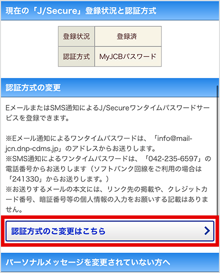 MyJCBにログインし、「インターネットショッピングでの本人認証サービス」を押下した先のページ内にある「認証方式のご変更はこちら」ボタンをタップする