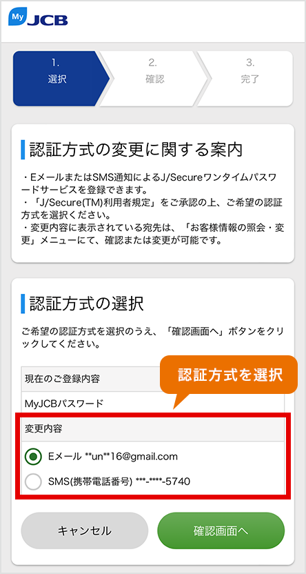 認証方式(Eメール/SMS(携帯番号))の登録内容を確認の上、変更を行う