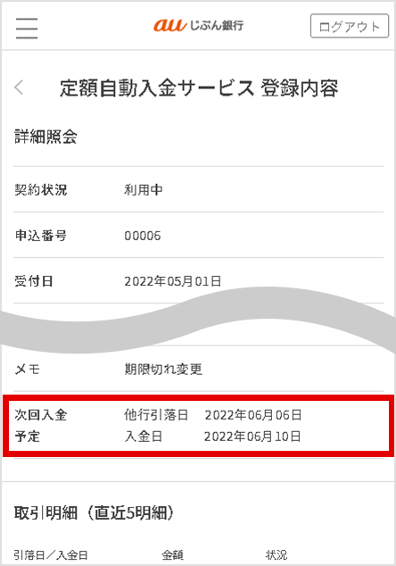 登録内容一覧(変更・解約)より明細を選択し、「次回入金予定」をご確認ください。
