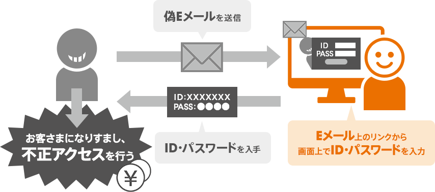 金融機関などを装って、メールやSMS(ショートメール)などで偽のホームページにアクセスするように仕向け、重要な個人情報を不正に取得しようとする犯罪です。