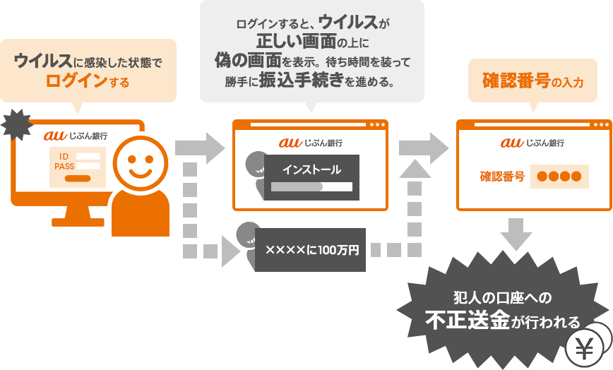 お客さまが、正しいオンラインバンキングにログインしても、そこから不正に送金をしてしまうウィルスです。